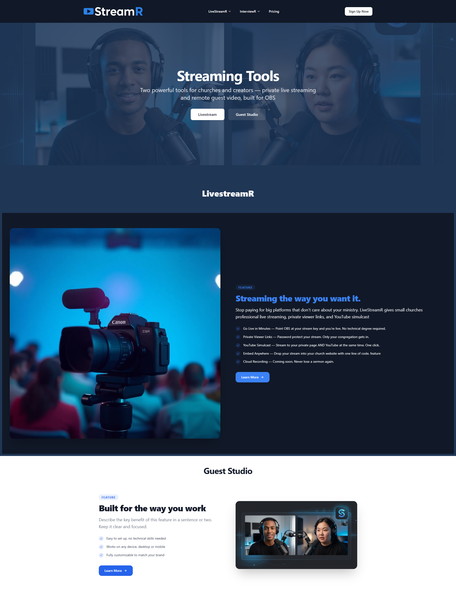Stream your services to Facebook, YouTube, and more simultaneously — without a technical team. useLiveStreamR handles the heavy lifting so your volunteers can focus on the service, not the screen.