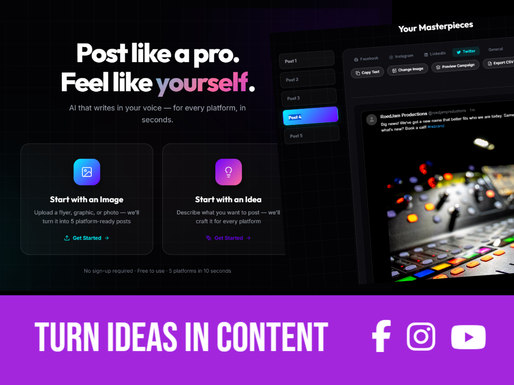 Stop staring at a blank screen every Monday morning. usePostR generates on-brand content for your church, and helps you to generate your post ideas, and keeps your ministry visible online — all week, every week.