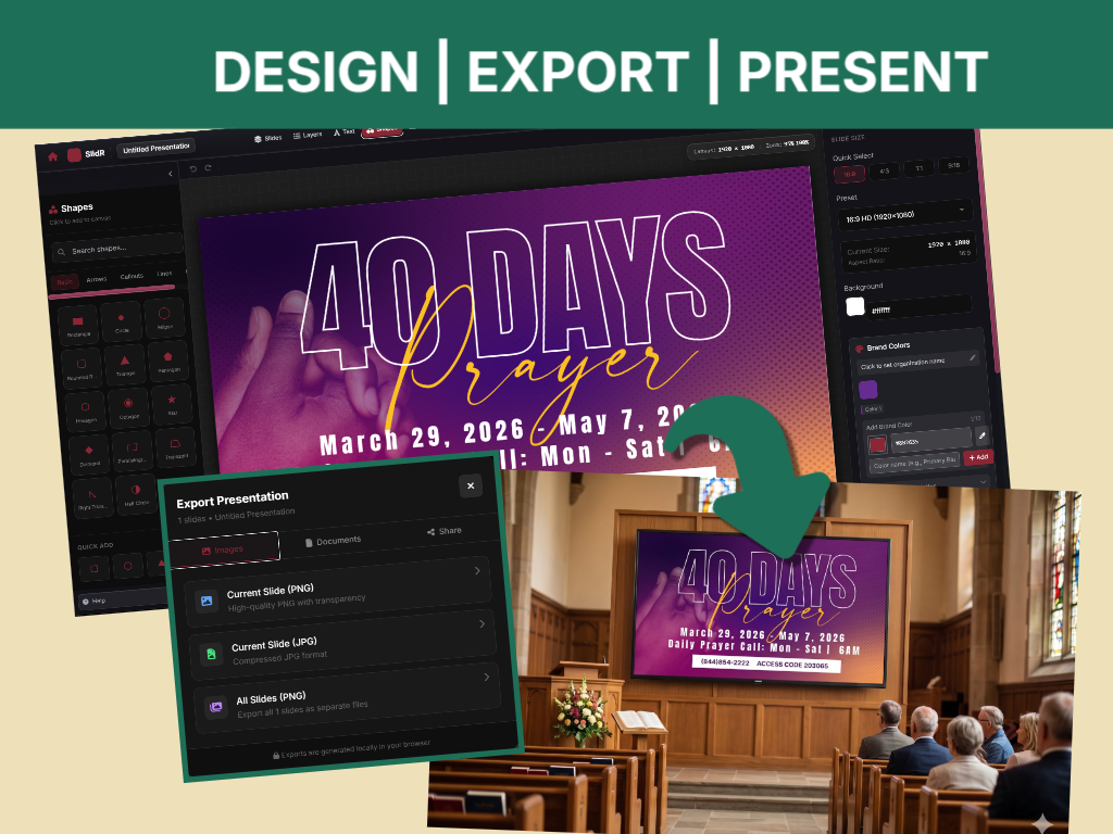 Stop wrestling with PowerPoint or paying ProPresenter prices. useSlidR gives you a professional canvas slide builder designed for Sunday mornings — announcements, scripture, sermon notes, all of it.